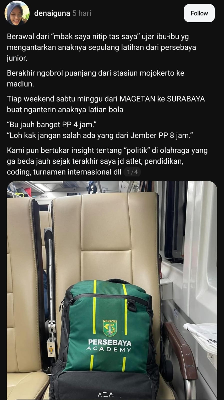 Di balik setiap mimpi anak yang ingin terbang tinggi, selalu ada orang tua yang berjalan setia di belakangnya. Begitu pula perjalanan Artha Erlangga Gibran Arief. Bersama sang ayah, Arief Marfianto, Erlangga rutin menempuh perjalanan panjang dari Magetan menuju Surabaya demi satu tujuan yaitu terus berlatih dan berkembang di Persebaya Academy.
